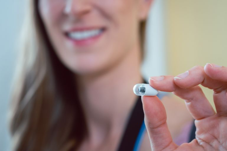 O paciente ingere a cápsula com uma pequena quantidade de água. A cápsula é ativada e começa a enviar os dados por radiofrequência ao receptor, que armazenará todas as informações.